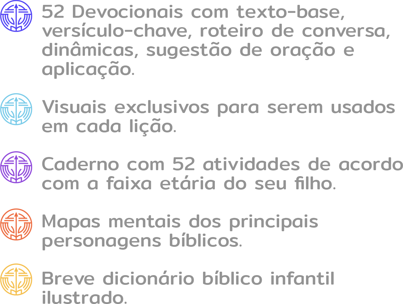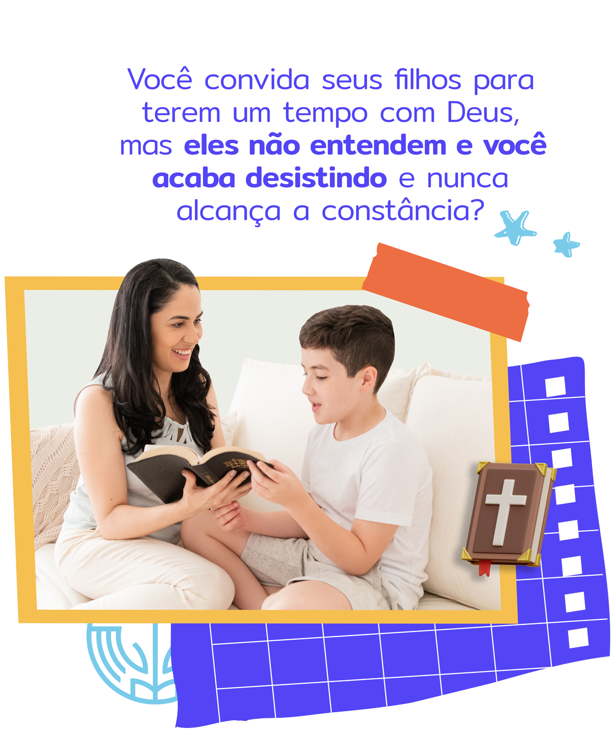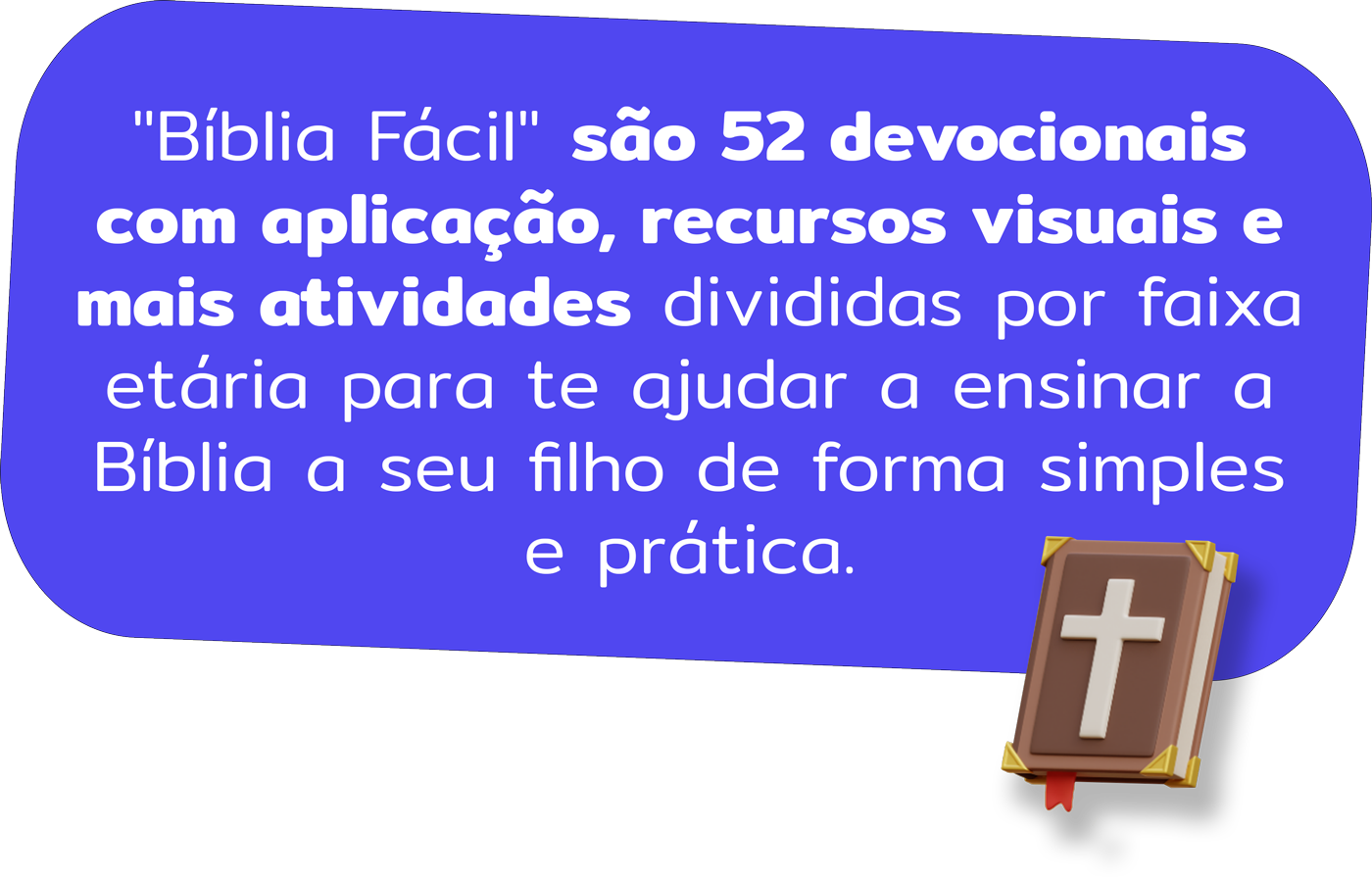 Você nunca mais vai travar na hora de fazer devocional com seus filhos! Em apenas poucos minutos, você conseguirá ensinar princípios cristãos sem perder a atenção da sua criança. Você só precisa: